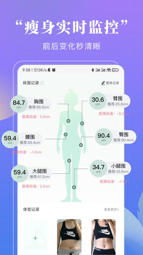 推荐身材指数:基于国际通用的健康标准,结合你的年龄、性别等个人信息,计算出最适合的体态目标区间。当你的实际数据偏离推荐范围时,系统会自动调整课程难度。