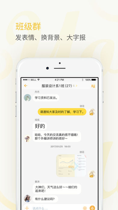 班级群:支持丰富的群聊功能,包括发表情、更换背景、发布公告等;