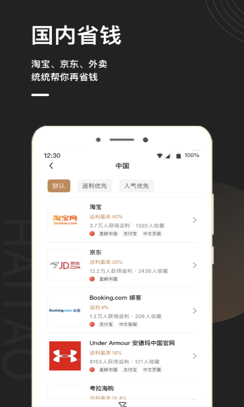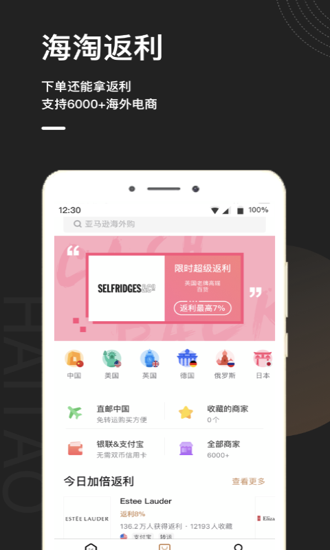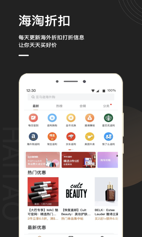 海淘全球购海外购物还能赚返利,折扣有,省钱。平台与国内,星巴克,淘宝,京东,,饿了么等合作,优惠券让你能省得更多,返利得更多。购物返现自动到账,累积起来还能兑换更多福利,省钱又实惠。