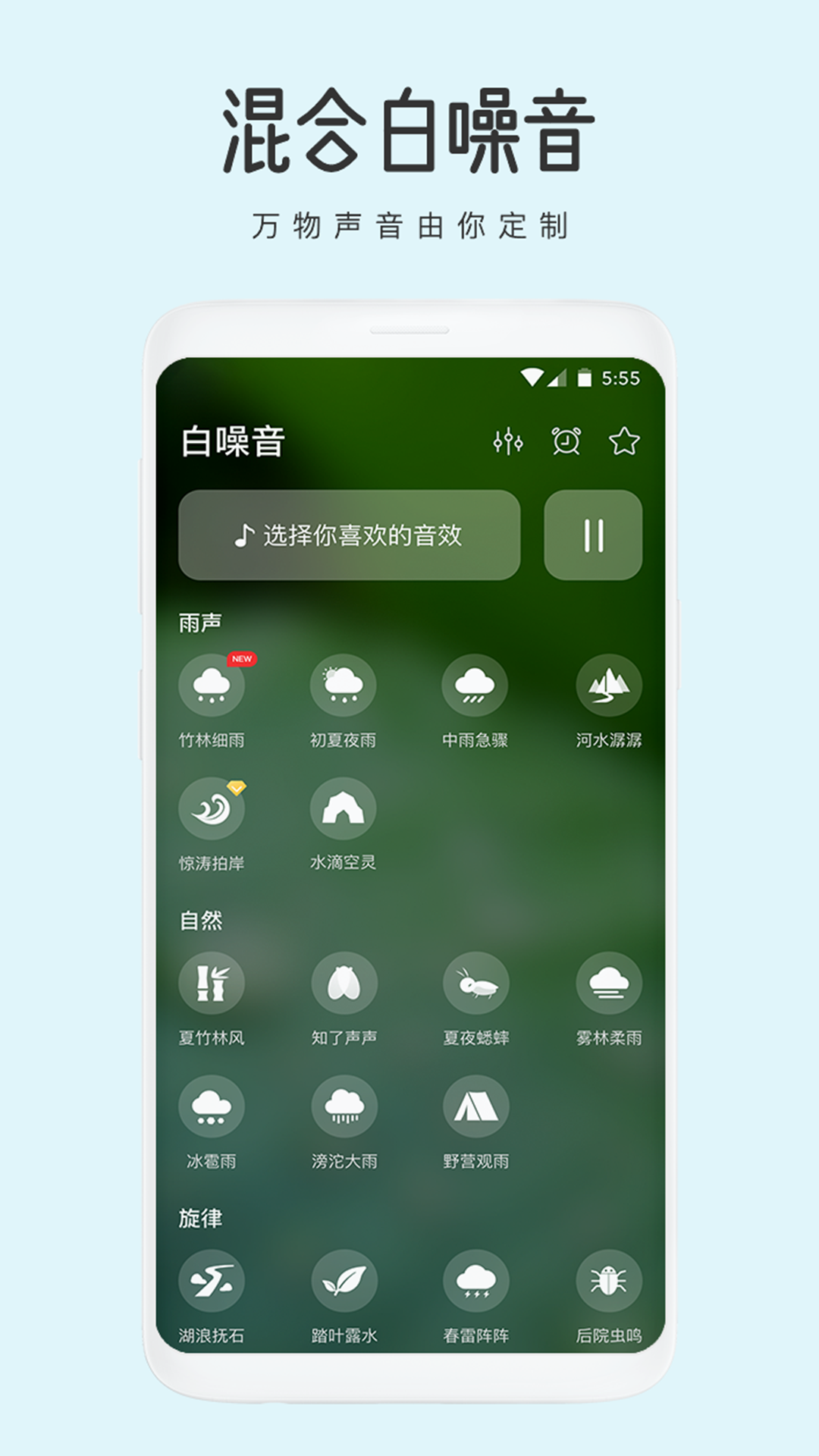可以自定义3种喜爱的声音混合播放,聆听世间万物的声音