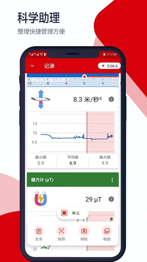 科学日记提供了多种实用功能,让你的科学实验和工作记录更加便捷。通过手机的内置传感器,你可以轻松测量光线强度,检查室内光线是否符合标准,或者科学记录太阳光环境的自然变化。软件还支持声音分贝测量,帮助你了解周围环境的噪音水平,保护听力健康。此外,科学日记还能精确测量加速度、线性加速度以及X、Y、Z轴的加速度变化,通过手机中的加速计检测运动状态和方向变化,为你的实验和活动提供精准数据支持。