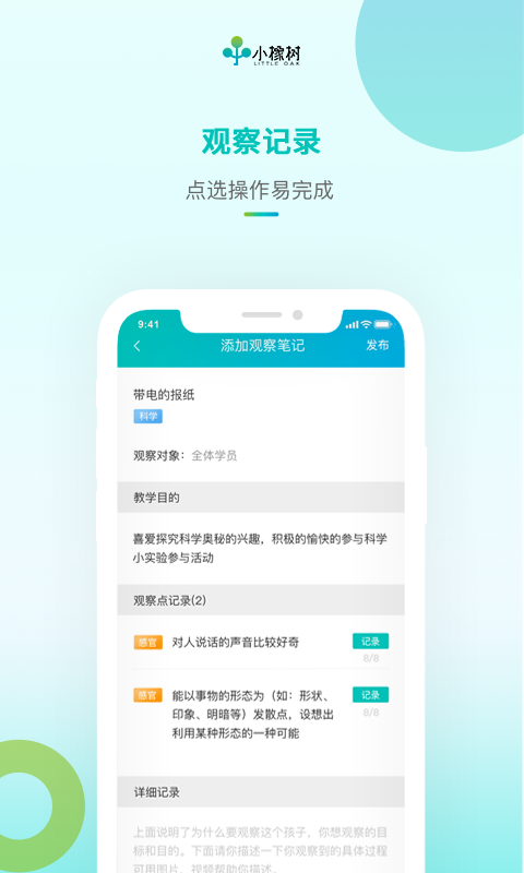 小橡树园丁是一款专为幼儿教育工作者打造的智能教学管理平台,通过数字化手段赋能教师日常教学工作。该应用以简洁直观的界面设计,帮助幼儿园、托育机构及培训中心的教师高效完成班级管理、教学记录、家校沟通等核心工作。平台整合了教学资源库、智能评估系统、班级动态发布等实用功能,让教师能够轻松掌握班级情况,同时为家长提供透明化的教学反馈,构建起家园共育的桥梁。