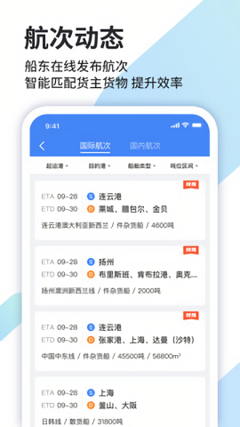 【航次发布】船东发布国际或国内航次信息,可以和货主的货盘智能匹配;国内船东也可电话咨询货主,帮助船东无缝对接;平台提供航线优化建议。