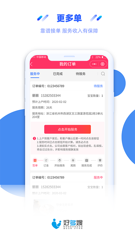 好多嫂app始终致力于打造中国最优质的母婴服务平台,以专业、贴心的服务理念赢得了众多家庭的信赖。平台专注于月嫂、育儿嫂、催乳师等家庭母婴服务领域,通过严格的筛选和培训机制,确保每一位服务人员都具备专业的技能和良好的职业素养。同时,好多嫂app还为平台上的服务人员提供了更加便捷的接单方式,帮助他们更好地展示自己的专业技能,从而为用户提供更高效、更优质的服务体验。