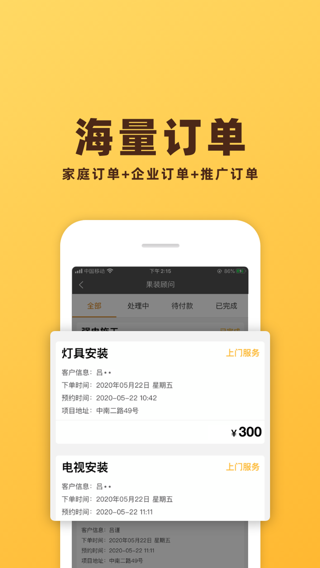 订单管理系统:平台提供完善的订单管理功能,包括家庭装修、企业维修等多种服务类型。您可以随时查看订单详情,了解客户需求,合理安排工作进度。