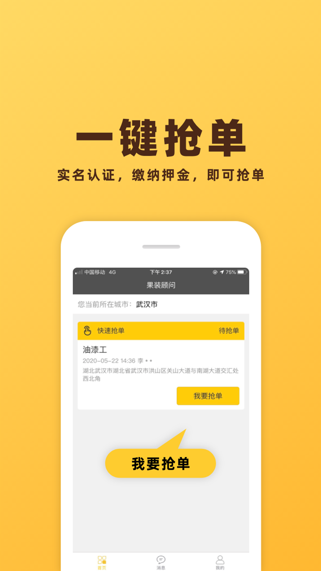 果装服务端app是武汉果装科技有限公司旗下专业的互联网工匠服务平台,致力于为全国各地的工匠师傅和用户搭建高效便捷的服务桥梁。作为果装旗下认证工匠,您将享受到平台提供的全方位支持,包括海量订单资源、智能派单系统、资金安全保障等优质服务,让您的工作更加轻松高效。