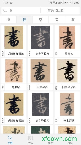 这是一本中国书法大字典,可以查询一个汉字的各种写法,图片均来自名家真迹,并可定位至原帖出处。系统收录了从商周甲骨文到当代名家作品,涵盖篆、隶、楷、行、草等各种书体,让您全面了解汉字演变历程。
