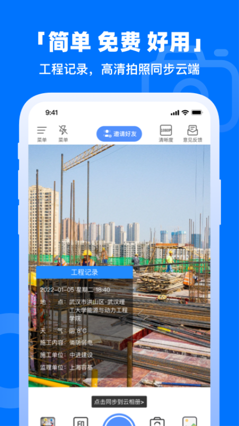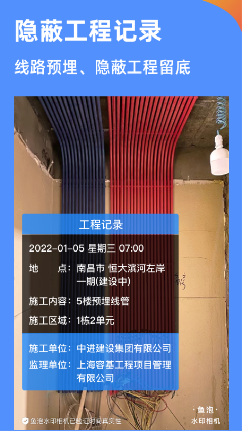 鱼泡相机软件是一款专为工程建筑、外勤人员设计的专业水印相机应用。它不仅具备常规拍照功能,还能为照片添加包含时间、地点等信息的防伪水印,确保工作记录的真实性和可追溯性。通过实时同步项目进度、上传视频记录等功能,帮助团队高效管理工程进度。其不可篡改的特性特别适合工地考勤、安全检查等需要真实记录的场合,同时也能满足微商、代购等群体的图片保护需求。无论是工程项目管理还是日常考勤打卡,鱼泡相机都能提供专业可靠的解决方案。