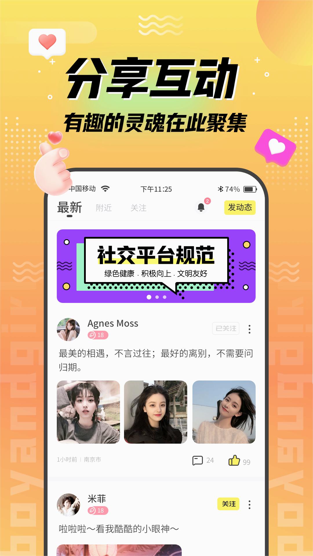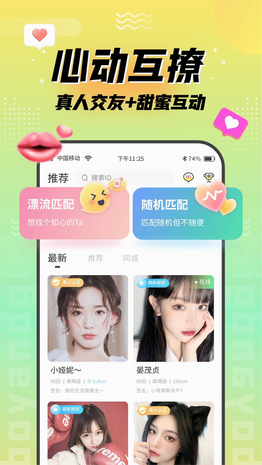 【心动互撩】陌趣是一款注重真实社交体验的软件,所有用户都经过严格认证,确保交友质量。在这里你可以放心展示魅力,通过趣味互动结识志同道合的朋友。