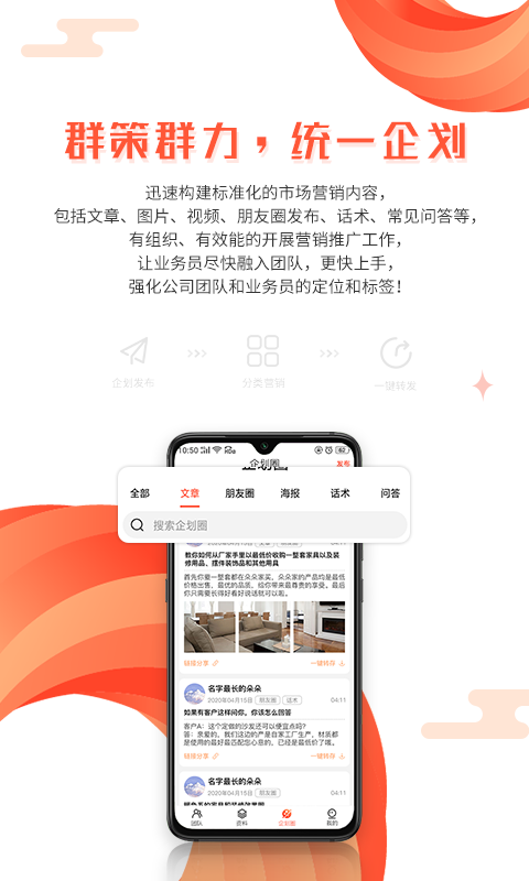 【营销管理】团队可以集中智慧,快速制定标准化的营销内容策略。应用支持多种营销内容形式的创建和管理,包括图文、视频、朋友圈文案等。通过统一的内容模板和话术库,新成员可以快速上手,保持团队营销风格的一致性。系统还提供营销计划制定、执行跟踪等功能,帮助团队实现营销目标。