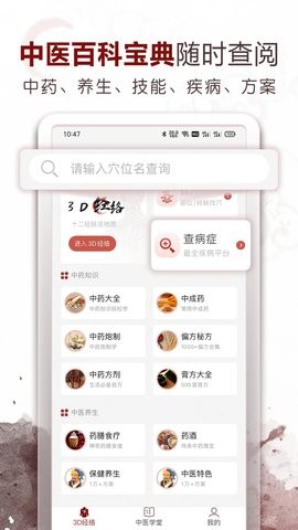 软件采用先进的3D动画技术,生动展示每个穴位的位置与作用,让学习过程更加直观有趣。无论你是初学者还是专业人士,都可以在平台上找到适合自己的学习内容。软件不仅具有高度的专业性,还注重知识的普及性,让更多人了解中医经络穴位的奥秘。平台还整合了海量的中医知识库和医学课程,用户可以随时随地观看学习,提升自己的中医理论水平。
