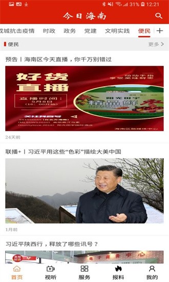 时政、政务、党建、文明实践、便民等丰富内容尽在其中,随时阅读;首页采用智能推荐算法,会根据用户浏览习惯推送个性化内容。每日更新的专题报道深入浅出,让用户全面了解海南发展动态。
