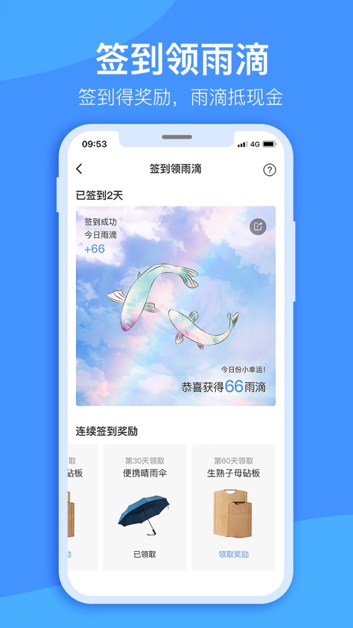 签到得奖励,雨滴抵现金,每日签到即可累积雨滴,直接抵扣现金