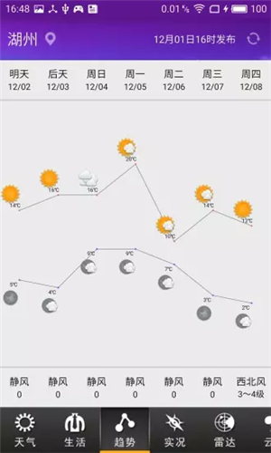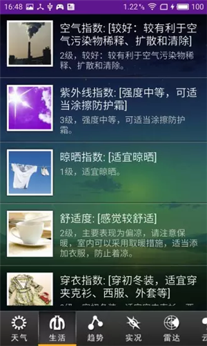 服务:提供包含穿衣指南、紫外线防护、感冒概率、运动适宜度、旅游舒适度等在内的12项生活指数,每个指数都配有详细说明和建议。这些贴心服务能帮助用户根据天气情况合理安排日常活动。