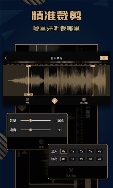 功能汇总:音乐剪辑铃声编辑、剪裁音乐、音频格式转换、音频合并拼接混音、歌曲制作合成、录音变声变音、剪接调整音量大小、淡入淡出、从视频提取音乐、调整速度。