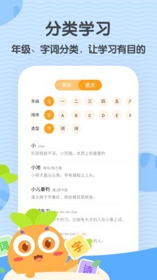 萝卜少儿词典app是一款专为儿童量身打造的学习助手,采用符合儿童认知特点的UI设计,色彩鲜艳、图标可爱,让孩子一眼就爱上学习。软件不仅支持基础的汉字、词语查询,还包含成语解析、古诗鉴赏等丰富内容,更有趣味单词拼写游戏,通过互动方式巩固学习成果,让知识记忆更加深刻持久。