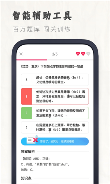 题型详解功能:每道题目都配有详细的解析说明,不仅指出正确答案,更深入分析错误原因,帮助学生真正理解知识点。