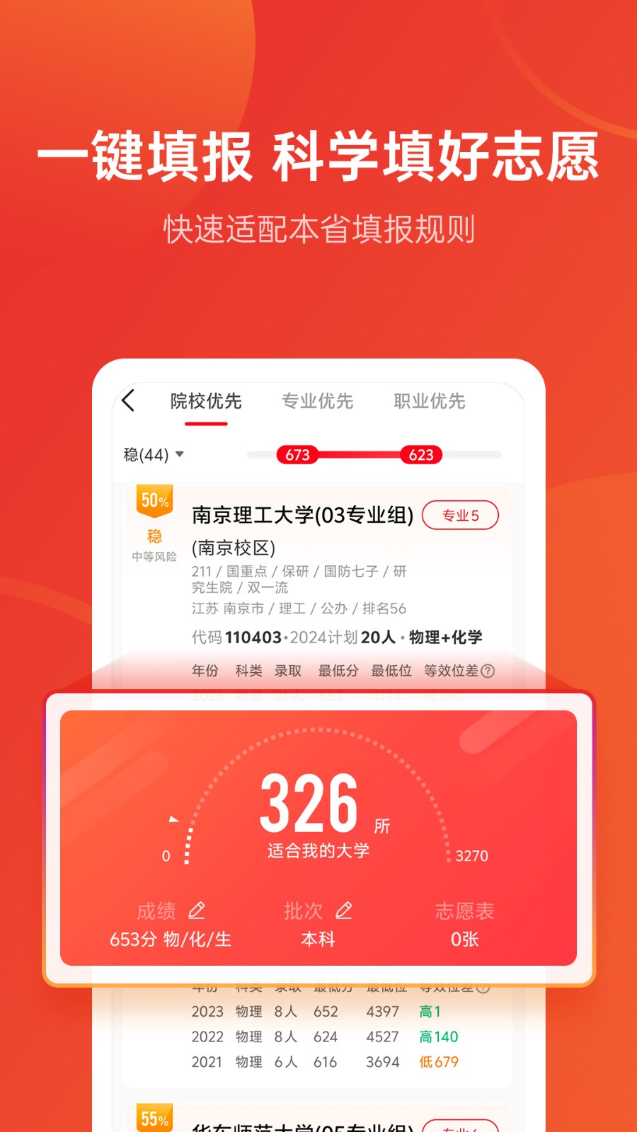 优志愿app官网版是经教育部门认证的专业高考志愿填报辅助平台。软件数据库覆盖全国所有本科、专科院校及2000多个专业,数据来源权威可靠。智能推荐引擎可根据考生分数、位次、兴趣等10多个维度,生成最优志愿方案。模拟填报系统支持保存多个方案进行对比分析。内置2018-2023年完整录取分数线数据库,支持按地区、院校、专业多条件查询。职业测评采用国际通用的霍兰德职业兴趣测试模型,准确率高达90%。支持家长和考生账号关联,实现数据实时同步。专家团队提供从政策解读到填报技巧的全方位指导。