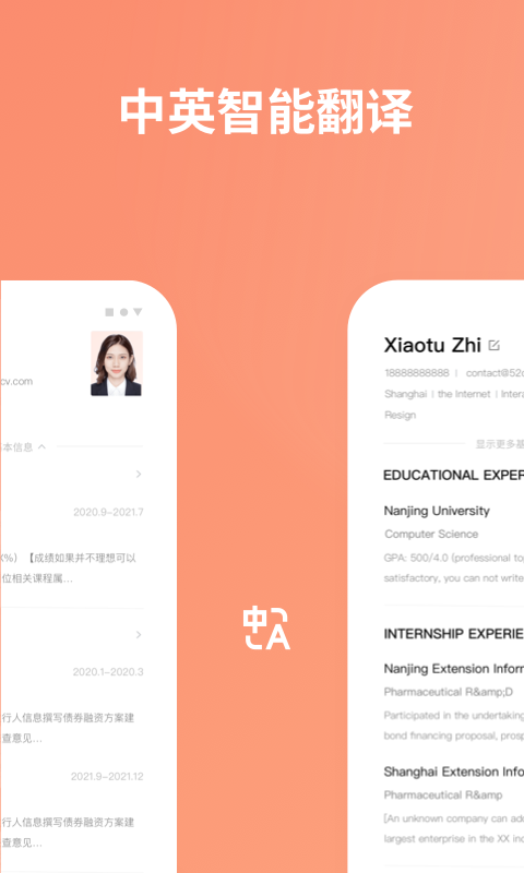智能中英文简历翻译,一键排版,一键简历评测等功能,让简历制作变得简单快捷。