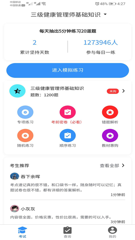 每日一练功能每天更新精选试题,让您随时保持最佳备考状态。这个功能不仅提供大量优质试题,还会根据您的答题情况智能调整难度,确保练习效果最大化。通过持续训练,2020年健康管理师考试将变得轻松易过。