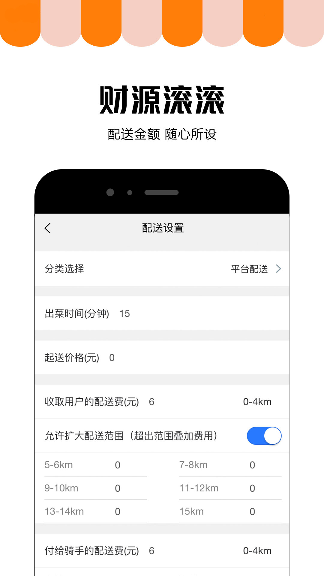 配送金额,随心所设;商家可以根据不同时段、不同区域灵活设置配送费,实现收益最大化。同时支持多种促销活动设置,吸引更多顾客下单。