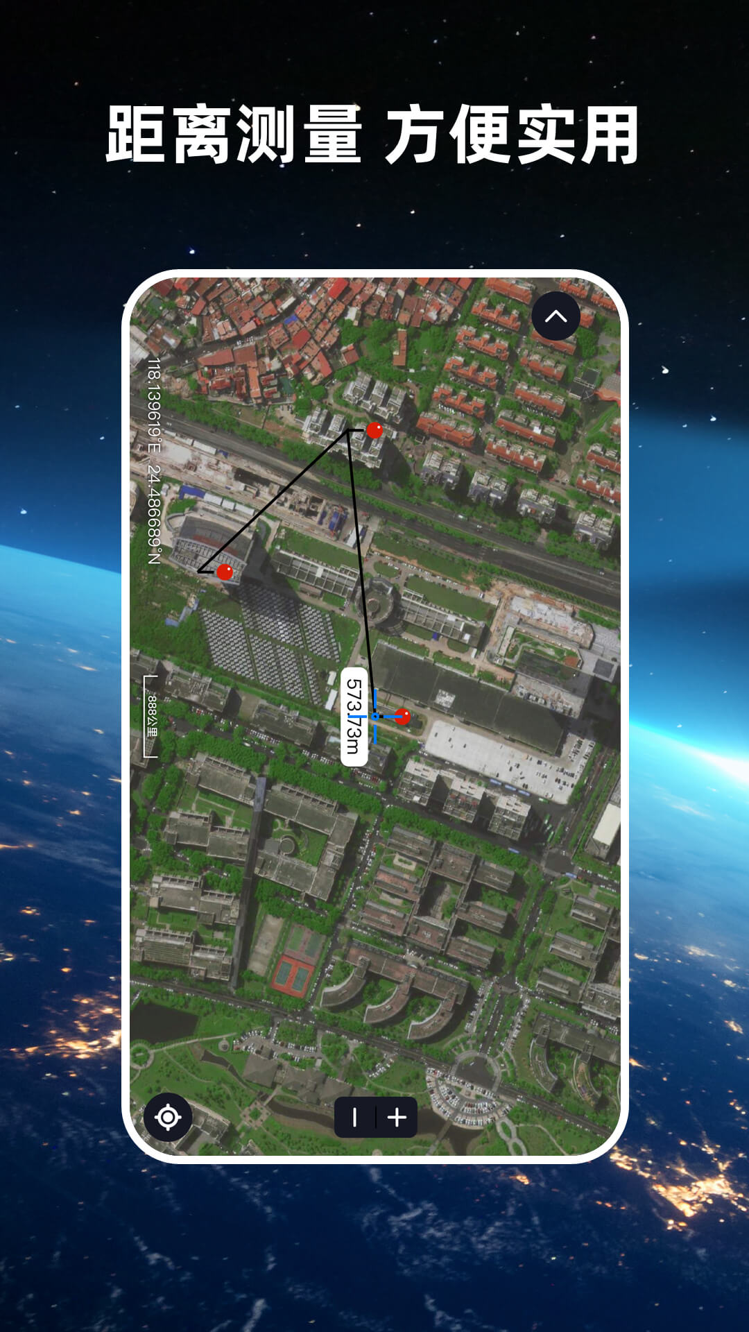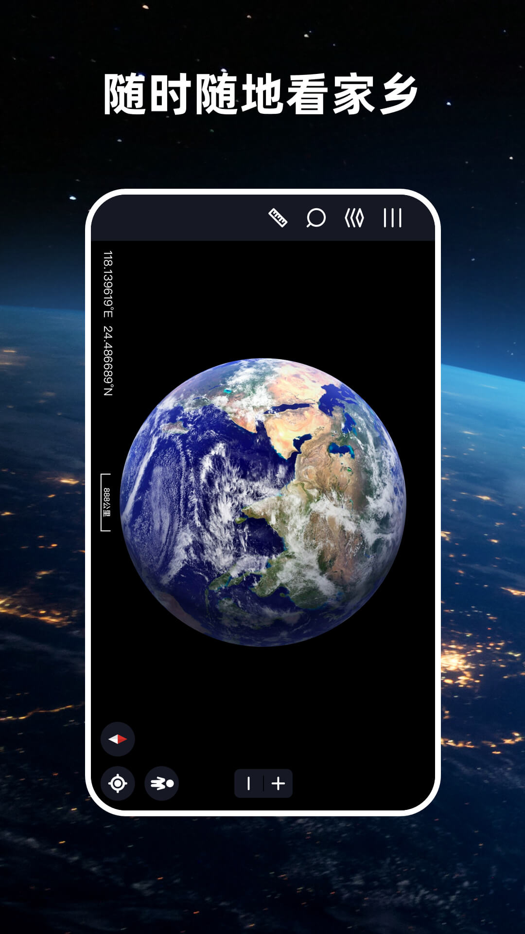 航路地球横版在界面设计上独具匠心,除了展示精美的3D地球外,还能实时显示当前位置的经纬度信息和地图比例尺。操作方面,应用提供了直观的放大缩小按钮,以及指南针功能帮助您快速定位正北方向。实用的测距功能让您可以轻松测量任意两点之间的距离,为出行规划提供便利。