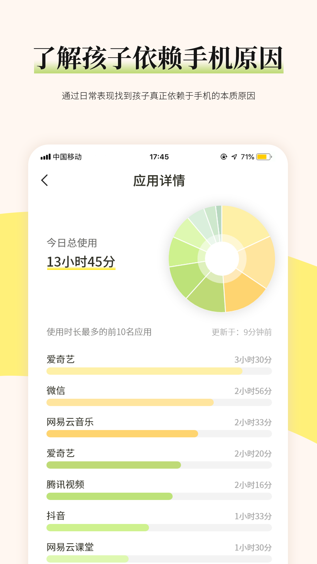 新增数据统计模块,提供应用使用时长的详细分析报告,支持按日、周、月查看使用趋势。新增异常使用提醒功能,当检测到使用时长超标时会自动发送预警。