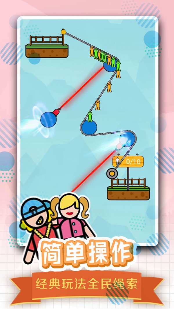 《全民绳索营救》是一款充满创意与挑战的益智闯关手游,玩家需要通过绘制绳索来解救被困人员。游戏采用清新可爱的卡通画风,搭配简单直观的操作方式,无论是儿童还是成年玩家都能轻松上手。丰富多样的关卡设计让每一关都充满新鲜感,从丛林到城市,每个场景都带来独特的救援挑战。游戏巧妙融合了物理引擎和策略元素,让玩家在享受解谜乐趣的同时,也能体验到紧张刺激的救援过程。