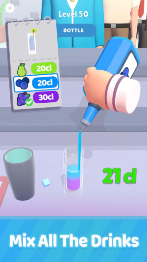游戏最吸引人的地方在于其丰富的调酒系统。你可以尝试将不同种类的酒进行创意搭配,每一款酒都有独特的颜色和风味,通过你的巧手调制,最终呈现出一杯杯令人惊艳的鸡尾酒。游戏中的调酒过程既快速又简单,让你轻松上手,同时也能感受到调酒的艺术性。此外,游戏还提供了多种调酒道具,包括各式各样的调酒杯、摇酒器和装饰物,让你能够像真正的调酒师一样展现专业技巧。
