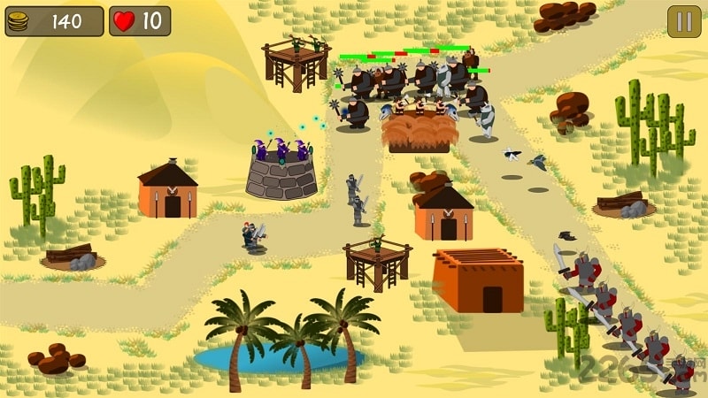 沙漠王国防御战修改版是一款以广袤沙漠为背景的深度策略塔防游戏。在这个充满挑战的世界里,玩家将扮演一位英明的军队统帅,肩负起保卫王国的重任。游戏不仅完美融合了传统塔防的核心玩法,还创新性地加入了资源管理和军事发展系统,为玩家带来前所未有的策略体验。你需要精心部署各种防御工事,合理调配不同兵种,运用智慧与谋略来抵御一波又一波邪恶势力的疯狂进攻。