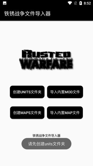 手机创建UNITS文件夹、创建MAPS文件夹,然后点击"导入内置MOD文件"按钮,将mod模组导入到软件内即可:系统会自动识别并完成导入,整个过程简单快捷。