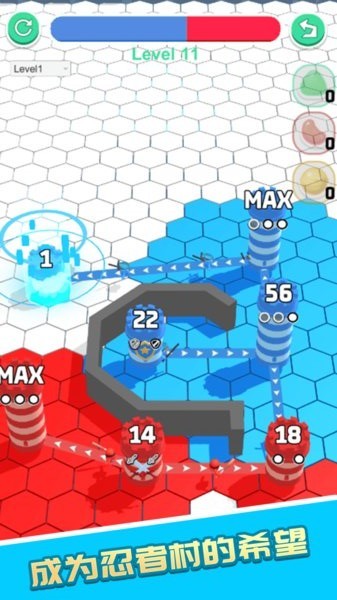 您将成为蓝色忍者的首领,需要根据战场上堡垒的数字强度来制定战术。游戏以数字谋略为核心,融合了策略与动作元素,为玩家带来独特的游戏体验。通过合理安排忍者的进攻路线,玩家可以逐步击破其他忍者村的堡垒,最终获得胜利。游戏画面精美,操作流畅,战斗特效炫酷,让玩家仿佛置身于真实的忍者世界。