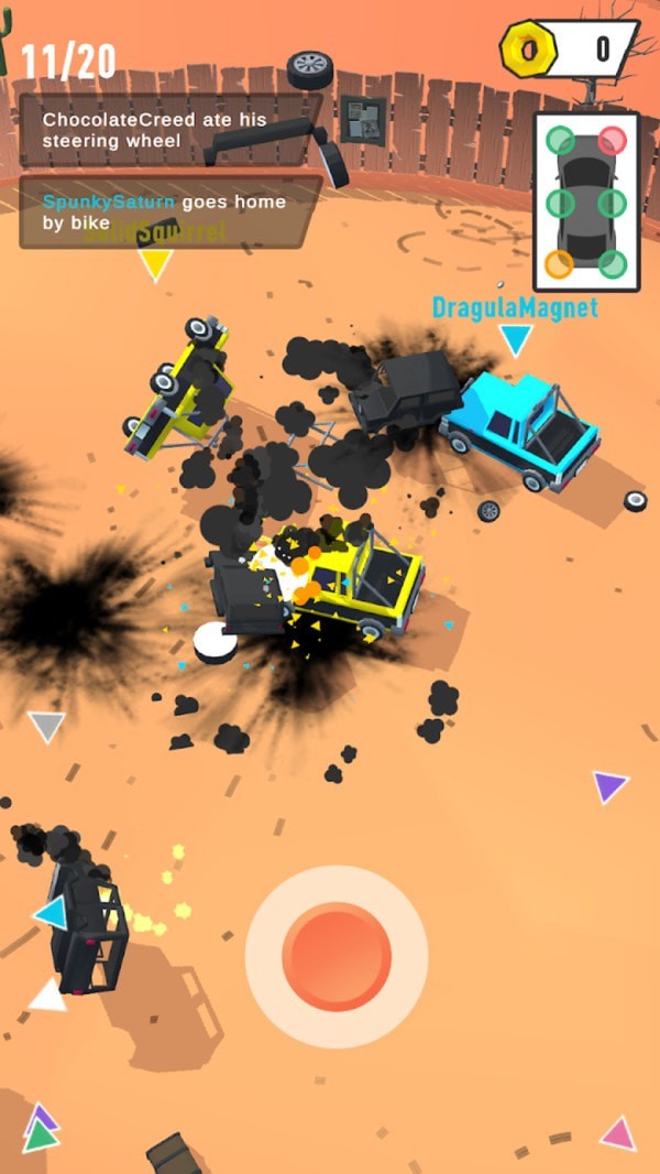 将你自己的对手全部都顺利的撞击出去,获得游戏全部的奖励。每场胜利都会解锁新的成就和称号,彰显你的战斗实力。你自己可以灵活的移动汽车位置,保证你自己的汽车可以不被敌人撞击。游戏提供多种操控模式,包括重力感应和虚拟按键,满足不同玩家的操作习惯。可以自由的掌握你自己的汽车,在蜂窝状的地图上开始撞击你自己的对手。地图会随机刷新增益道具,为战局增添更多变数和乐趣。