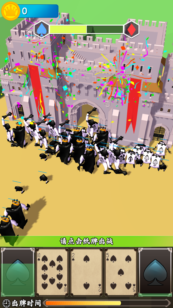 玩家通过点击卡牌将黑桃兵部署到战场,不同强度的卡牌有着相应的冷却时间。自动合成系统让相同的卡牌可以升级为更强大的单位,直到达到最大尺寸。游戏胜负取决于能否在敌方攻破己方城池前先攻陷对方城堡。多变的战场局势要求玩家时刻调整战术,体验紧张刺激的攻防对决。