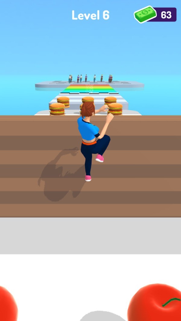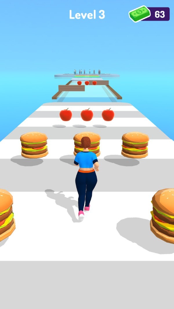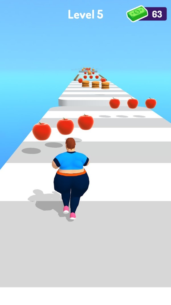游戏的核心玩法是控制角色在跑道上收集苹果等健康食物,同时避开汉堡包等高热量食品。苹果可以帮助减轻体重,而垃圾食品则会让角色变胖,影响移动速度。这种直观的体重变化机制让游戏目标清晰明确。