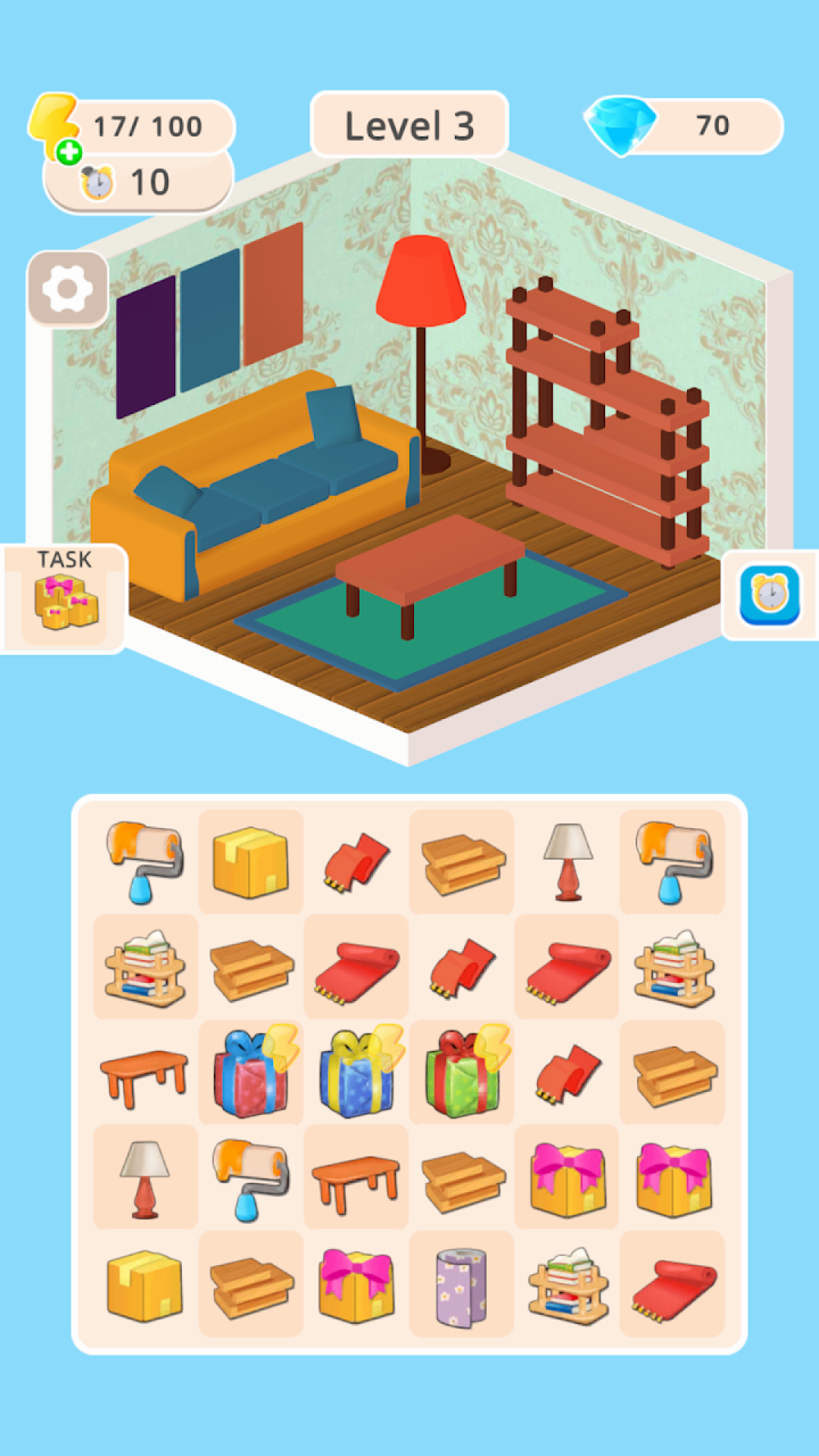 《一起搭个房》提供了循序渐进的设计挑战。从改造一个普通住宅的客厅开始,逐步解锁更多复杂的项目,最终您将有机会设计带有花园、游泳池等设施的豪华别墅。游戏的核心玩法是通过匹配图案来解锁新的装饰元素,这些元素将帮助您打造出独具特色的梦想之家。