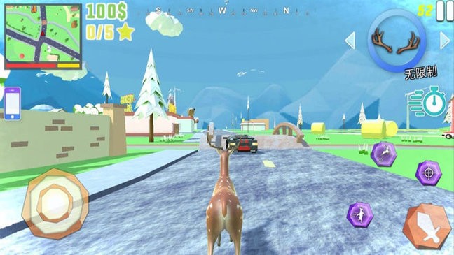 在这款3D卡通风格的开放世界游戏中,你将扮演一只拥有超能力的魔性麋鹿。除了标志性的伸缩脖子和感染人类的能力外,游戏还加入了全新的载具系统,让你可以骑着滑板车在城市中横冲直撞。昼夜交替的动态天气系统让每次探索都充满新鲜感,而随机触发的特殊事件则可能让你偶遇外星人或是卷入帮派斗争。游戏的操作经过精心优化,无论是奔跑、跳跃还是使用特殊能力都只需简单按键即可完成。
