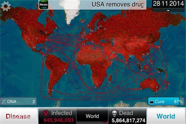 理论上,在游戏初期,建议您尽量提升传播速度,因为一旦致死率提高,政府会立即展开解药研发,而在DNA点数紧张的情况下,很可能导致挑战失败。游戏内置智能AI系统,各国政府会根据病毒特性采取不同应对措施,从边境管控到全民检测,这些都将考验玩家的策略应对能力。