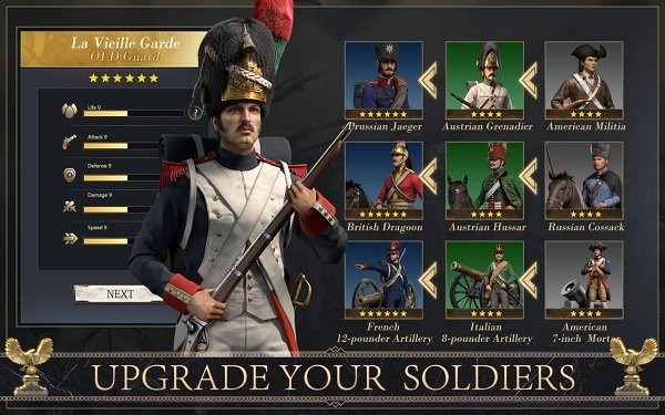 奥地利骠骑兵、波兰枪骑兵、英国龙骑兵、法国老近卫军、普鲁士骑炮兵等数十种历史著名兵种悉数登场。招募强大的士兵们进入您的军团,用强大的军事实力踏平整个世界!每个兵种都有独特的属性加成和克制关系,合理搭配才能发挥最大战力。