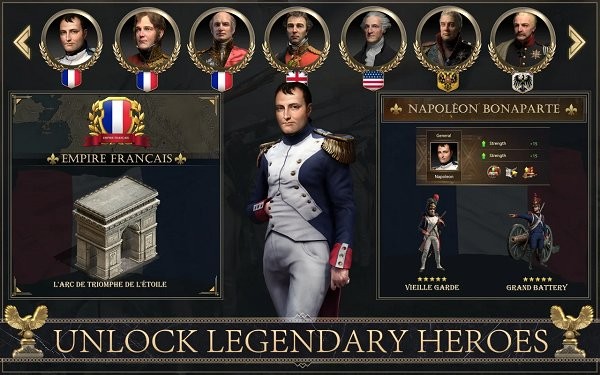 招募传奇英雄,为你征战四方:拿破仑、威灵顿、库图佐夫等历史名将任您调遣,每位将领都拥有独特的技能和战术风格。