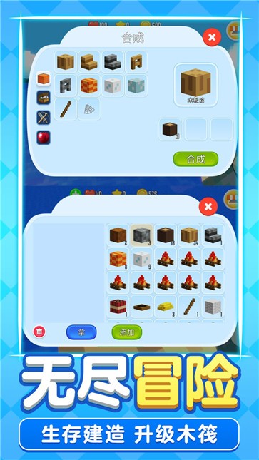 独特的木筏建造系统,从最初2x2的基础木筏,可以逐步扩建为包含种植区、储物区、工作台的多功能海上家园;