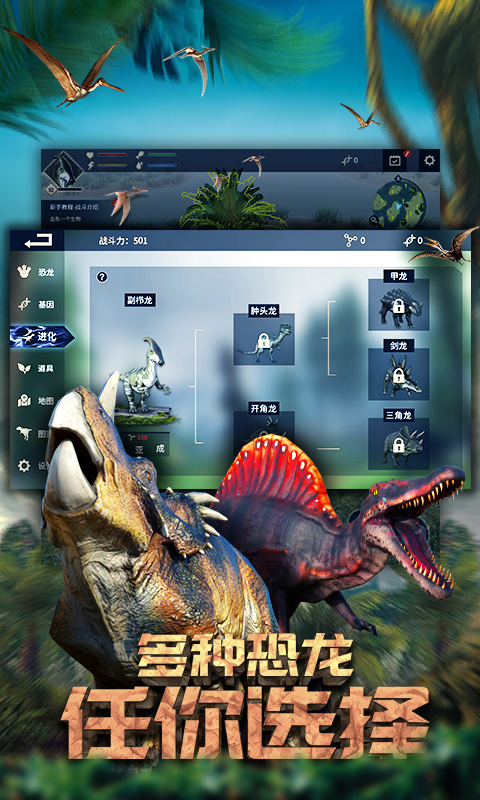 三角龙:最具代表性的食植恐龙之一,以其标志性的三只角和巨大的颈盾著称。游戏还原了它们7000万年前在北美洲的生活场景。