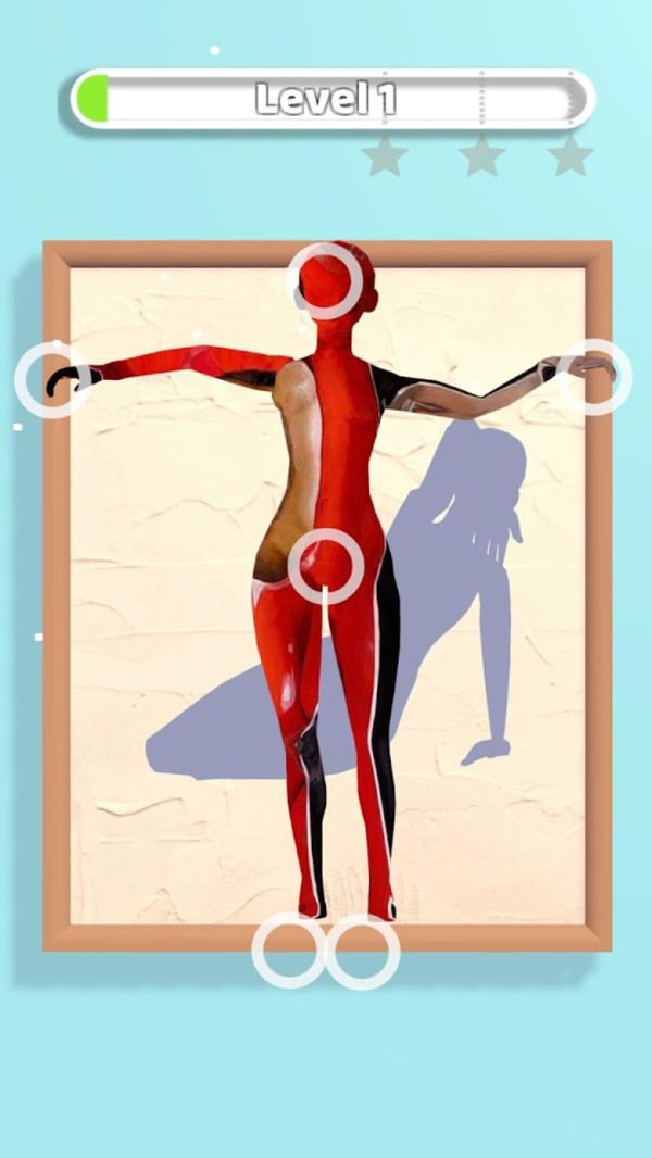 在《人体染色术》中,玩家将面对一个动态的人体轮廓,需要通过拖拽调整各个身体部位的位置。当所有肢体准确对齐时,原本模糊的图案会神奇地显现出来。游戏采用物理引擎模拟真实人体运动,每个关节都能360度自由旋转。随着关卡推进,轮廓复杂度会逐渐提升,从简单的静态姿势发展到需要协调多个部位的动作组合。