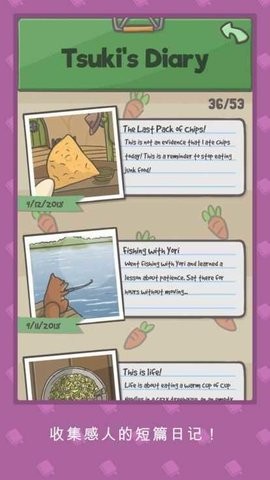 游戏玩起来比较自由,可没有时间限制,你想去干嘛都可以,只需要注意胡萝卜成熟的时间去收取就可以了,还可以购买玩具,每完成一件事情可以写日记,乡村的生活原来这么美好,跟着Tsuki一起来体验吧。游戏特别设计了日记系统,玩家可以记录下月兔的日常点滴,这些温馨的片段将成为珍贵的回忆。随着游戏时间的推移,玩家能真切感受到与月兔共同成长的乐趣。