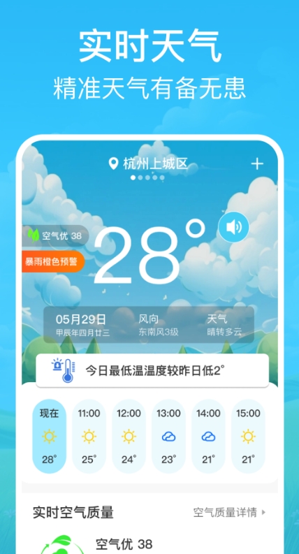 快准天气是一款专业且便捷的天气预报应用,致力于为用户提供精准、实时的气象信息服务。无论是日常生活还是出行规划,它都能成为您的得力助手。软件整合了权威气象数据源,确保天气信息的准确性和及时性,让您随时掌握温度、湿度、风力等关键指标。界面简洁直观,操作流畅,支持多城市切换和语音播报功能,满足不同场景下的使用需求。此外,它还提供灾害天气预警功能,帮助您提前做好防范措施,保障安全。