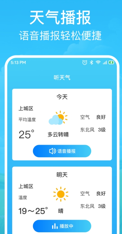 支持一键语音播报当前及未来天气情况,无论是驾车途中还是忙碌时,都能轻松获取天气信息,方便快捷。语音播报清晰流畅,支持多种语言选择,特别适合驾驶、运动等不方便查看手机的场景使用。