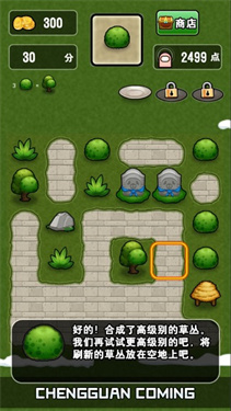 如附近有着同样的小草会和新放置的小草进行合并,再点击小草即可确认放置。注意观察合成路径提示,合理安排同类建筑的位置关系可以触发连锁反应,一次性完成多组合成获得额外分数奖励。