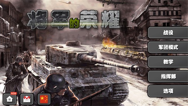 将军的荣耀国际版界面如图所示,可以在游戏界面选择不同的战斗开始游戏,可以查看高级战术。建议新手先从简单难度开始熟悉游戏机制。