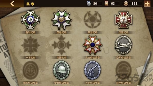 荣誉查看:胜利奖章、英雄奖章、荣誉奖章、国家奖章、十字奖章、帝国奖章、杰出作战奖章、空军作战奖章。完善的成就系统记录玩家的辉煌战绩。