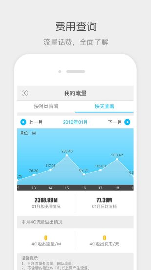 统计全面性:软件支持分类实时监测用户套餐剩余流量、本地流量、国内流量、共享流量以及定向流量等多种流量信息。同时还能查询话费余额,帮助用户全面掌握通信消费情况,确保网络畅通无阻。